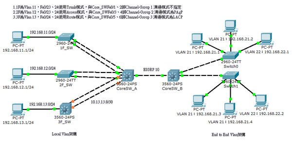 以上若設定完畢,CoreSW_A左方PC彼此全部可互Ping,CoreSW_B右方同網段PC彼此可互Ping